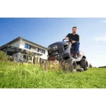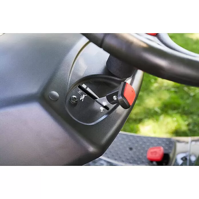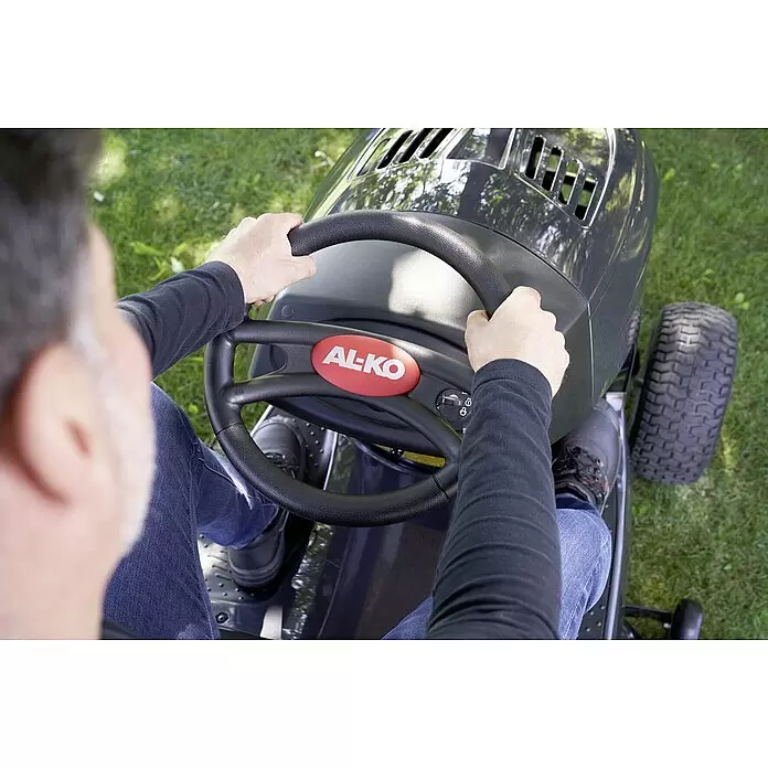 Schnell und mühelos viel schaffen mit dem AL-KO Benzin-Rasentraktor Easy 15-93.2 HDS-A – Hochwertige Komponenten, entwickelt in Deutschland und gefertigt in Österreich: So präsentiert sich der Rasentraktor AL-KO 15-93.2 HDS-A als Easy Edition. Dank des Seitenauswurfs entfällt das Leeren des Grasfangkorbs, sodass sich sogar größere Grundstücke in einem Mähgang schnell bearbeiten lassen. Dabei behält der Rasentraktor jedoch eine hohe Wendigkeit und fühlt sich dadurch in den meisten Gärten wohl. Umfangreiches Rasentraktor-Zubehör, wie Gartenwalze, Schneeschild, Anhängerwagen u. v. m., und das leicht ausbaubare Mähdeck machen ihn zu einem Multitalent im Sommer wie im Winter. Wer einen preisgünstigen Rasenmähertraktor für fast jeden Einsatzzweck sucht, ist mit diesem Produkt bestens beraten. – Seitlich auswerfen und komfortabel auf Mulchfunktion umrüsten – Der Rasentraktor aus der Easy-Kategorie ist mit seiner Schnittbreite von 93 cm perfekt geeignet, um größere Rasenflächen (geeigent für bis zu 4500 m²) effizient und schnell zu mähen. Angetrieben wird der Rasentraktor AL-KO Easy 15-93.2 HDS-A von einem 8,5 kW starken, vibrationsarmen AL-KO Pro 450 Motor. Die Schnitthöhe lässt sich schnell und einfach mit einem Handgriff in 6 Stufen von 30 mm bis 80 mm verstellen. Das langlebige Mähdeck aus Stahlblech beinhaltet zwei Messer für einen sauberen Grasschnitt und kann mit einfachen Handgriffen ausgebaut werden. Dadurch sind eine schnelle Reinigung und ein zeitsparender Messerservice möglich. – Möchten Sie die Mulchfunktion dieses Traktors nutzen kann dieser werkzeuglos umgerüstet werden. Der Mulchverschluß ist praktisch am Mähdeck verstaubar. Durch den stufenlosen Fußhydrostat können Sie mit den ergonomisch angeordneten Pedalen und der optimalen Sitzposition ganz entspannt mähen. – An die Front des Rasenmähertraktors AL-KO Easy 15-93.2 HDS-A kann zudem im Winter ein Schneeschild angebaut werden. Durch Zubehör wie unsere Gartenwalze, Combi Trailer und Düngestreuer unterstützt dieser Rasentraktor Sie auch im Sommer bei weiteren Arbeiten. Die extra großen Reifen der Antriebsachse mit 18 Zoll sorgen auf jedem Untergrund und in jedem Terrain für einen guten Grip und zügiges Vorankommen. Einen weiteren Komfortvorteil bieten sowohl das griffige Lenkrad als auch die übersichtlichen Bedienelemente.