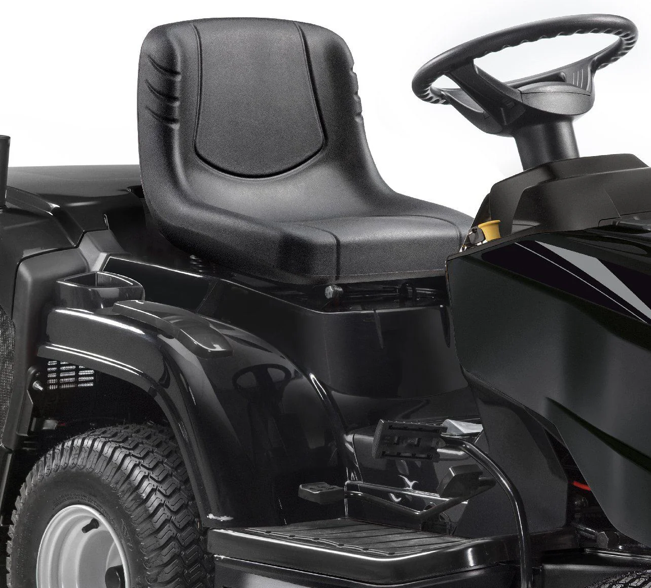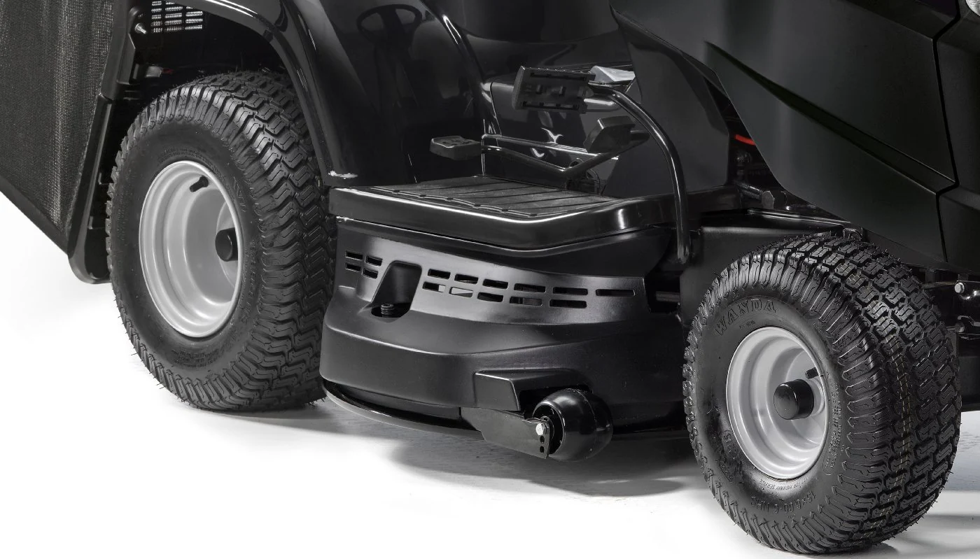 Sie haben die Wahl zwischen sieben voreingestellten Schnitthöhen. Ein hydrostatischer Antrieb, der über ein Fußpedal gesteuert wird, optimiert die Kontrolle und Manövrierfähigkeit, indem die Einstellung der Fahrgeschwindigkeit in stufenlosen Schritten ermöglicht wird.