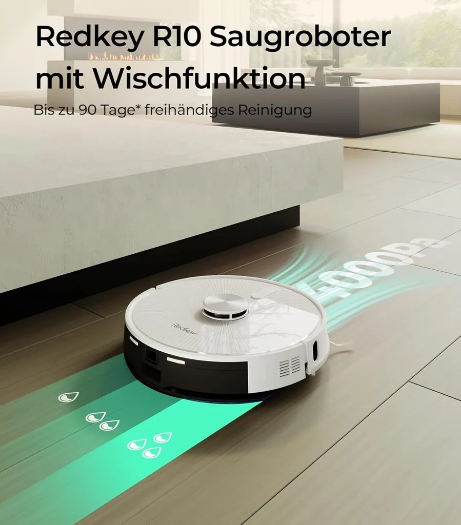 【Kompakte Größe, Hohe Leistung】: Mit einer Höhe von nur 9.4 cm und einem Durchmesser von 33 cm kann dieser kompakte Roboter-Staubsauger selbst unter Möbeln versteckten Staub und Tierhaaren erreichen und aufsaugen. Man kann im Voraus Sperrzonen und No-Go-Zonen einrichten. Wenn der Redkey R10 einen Teppich erkennt, kann er ihn automatisch umgehen. Seine Hindernisüberwindungshöhe beträgt 18 mm, können der Staubsauger und der Wischmopp kombiniert werden, um 4 verschiedene Modi anzubieten (Staubbehälter 400 ml, Wassertank 350 ml)