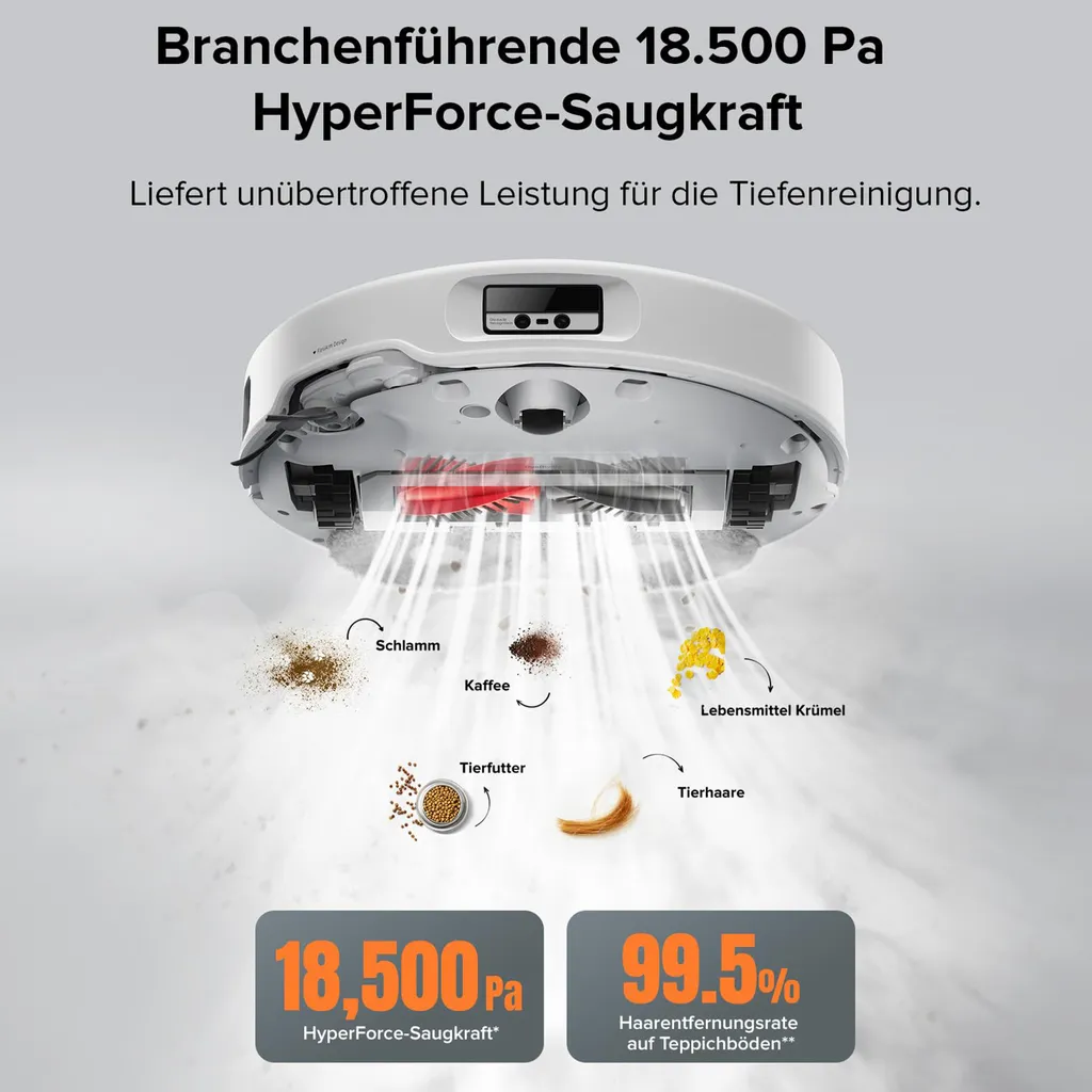 - Branchenführende 18.500 Pa Saugleistung – Entfernt selbst feinste Partikel aus Teppichen und Fugen.