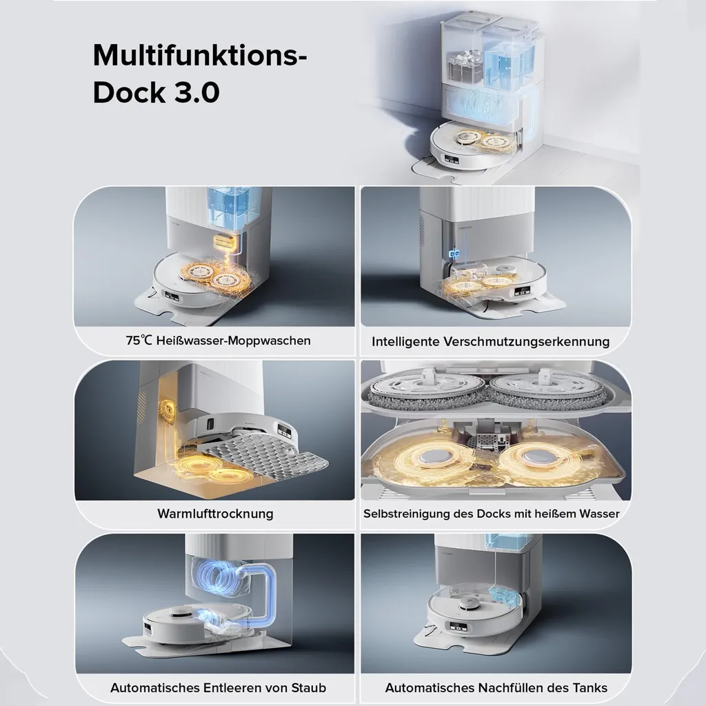 ✔ Wartungsarm: Doppelter Verhedderungsschutz + Selbstreinigungsstation