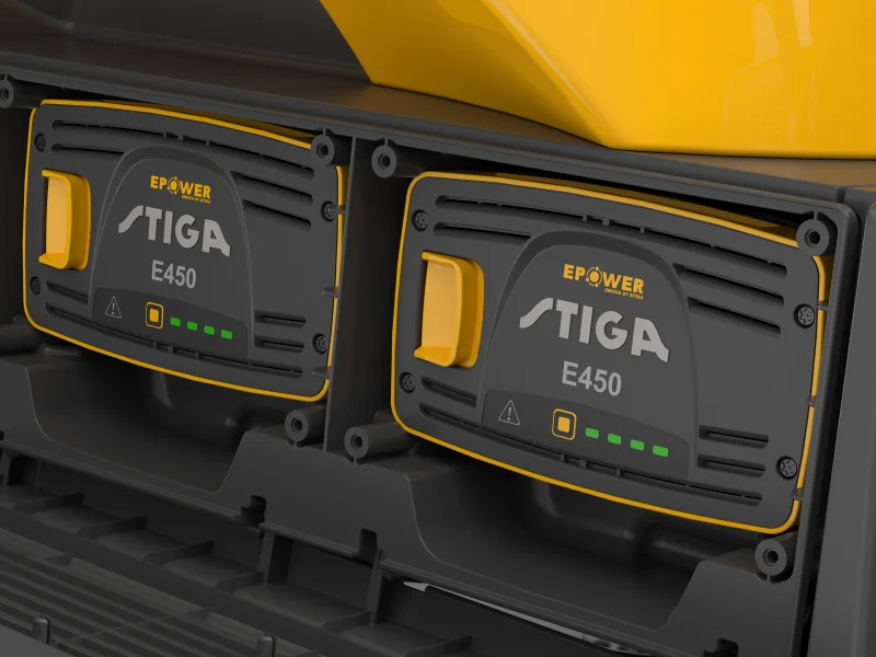 Für die benötigte Energie ist der Stiga Swift mit drei E 450-Akkus (48 V/5 Ah) ausgestattet. Beim Mähen benötigt der Mäher mindestens die Power von drei Akkus, wohingegen zum Fahren nur zwei benötigt werden. Die Akkus sind austauschbar und können auch für andere Stiga Gartengeräte der 500er, 700er und 900er Serie verwendet werden. Die aufeinander abgestimmten Akkus optimieren die Laufzeit und Leistung. Im Eco-Modus können Sie die Effizienz steigern und mit einer Komplettladung sogar bis zu 1.400 m² mähen.
