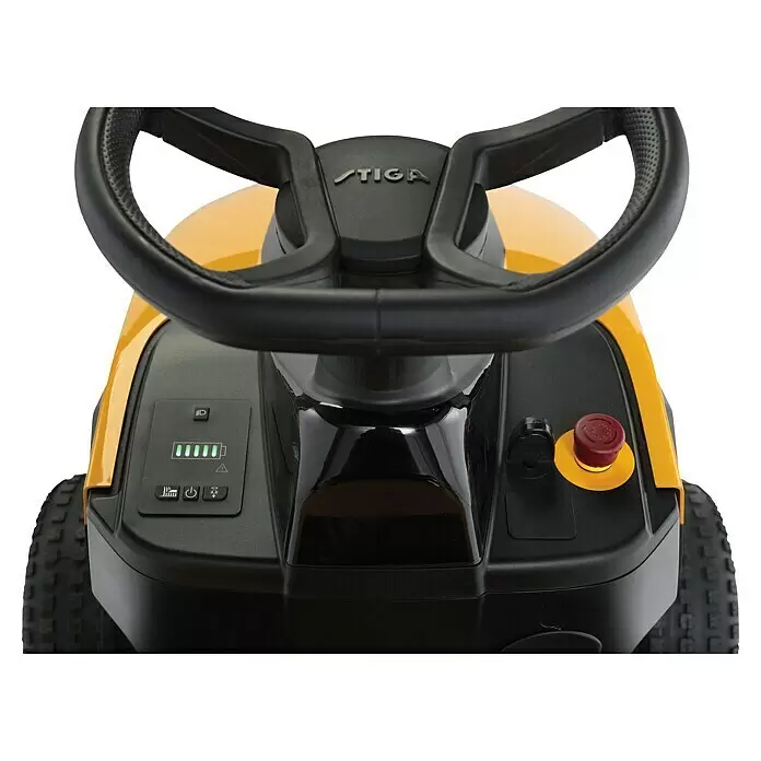 Das benutzerfreundliche Armaturenbrett ist mit einer Akkustandanzeige und Schnellstarttaste ausgestattet. Mit dem 1,2-kW-Transaxle-Motor erreichen Sie Geschwindigkeiten von bis zu 9 km/h, während zwei Messermotoren insgesamt 3 kW ohne Riemen, Riemenscheiben und aufwendige Instandhaltung erreichen. Dank der großzügigen Schnittbreite von 98 cm und den 7 zwischen 25 mm und 80 mm einstellbaren Schnitthöhen ist jeder Mähdurchgang eine wahre Freude.