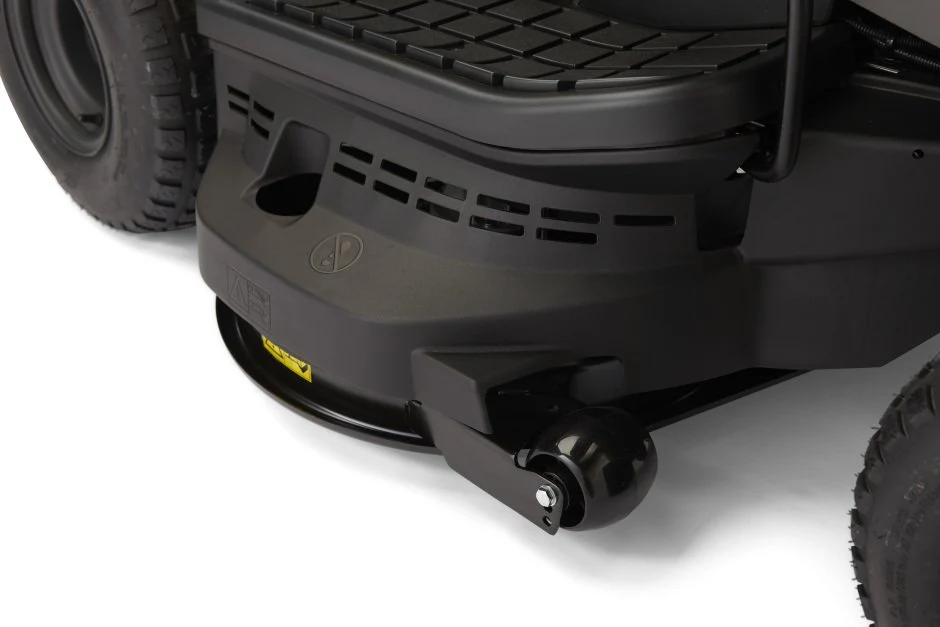 Die Stützräder verhindern beim Wenden auf unebenem Gelände unansehnliche Rasenschäden durch das Mähdeck; der Reinigungsanschluss ermöglicht das schnelle und einfache Entfernen von korrrosivem Material von der Mähdeckunterseite.