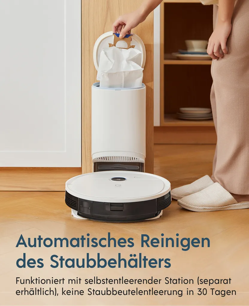 - [Automatische Entleerung des Staubbehälters]Verwenden Sie die yeedi Selbstentleerungsstation (separat erhältlich) für das automatische Entleeren des Staubbehälters. Die Station ist mit einem Staubbeutel mit einem Fassungsvermögen von 2,5 Litern ausgestattet, der Schmutz für bis zu 60 Tage sicher aufbewahren kann, ohne dass der Staubbehälter des Roboters manuell entleert werden muss.